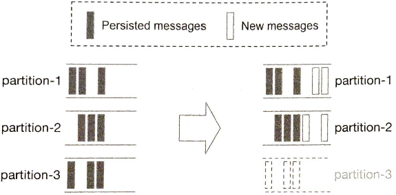 - 파티션 퇴역 후 실제로 제거가 이루어지는 시점까지 생산자는 메시지를 남은 두 파티션으로만 보내지만 소비자는 세 파티션 모두에서 메시지를 읽는다.