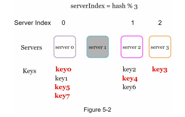 키 값을 해싱한 값에 나머지 연산을 하여 저장될 서버가 결정된다.